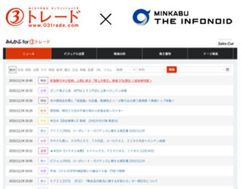 2021年1月,正式向丸三證券提供股票數(shù)據(jù) 2021年1月4日 株式會社みんかぶ與丸三證券聯(lián)手,為投資者推出了名為「MINKABU for 03trade」的服務(wù),為更多的個人投資者提供快速、準確、全面的金融服務(wù)。